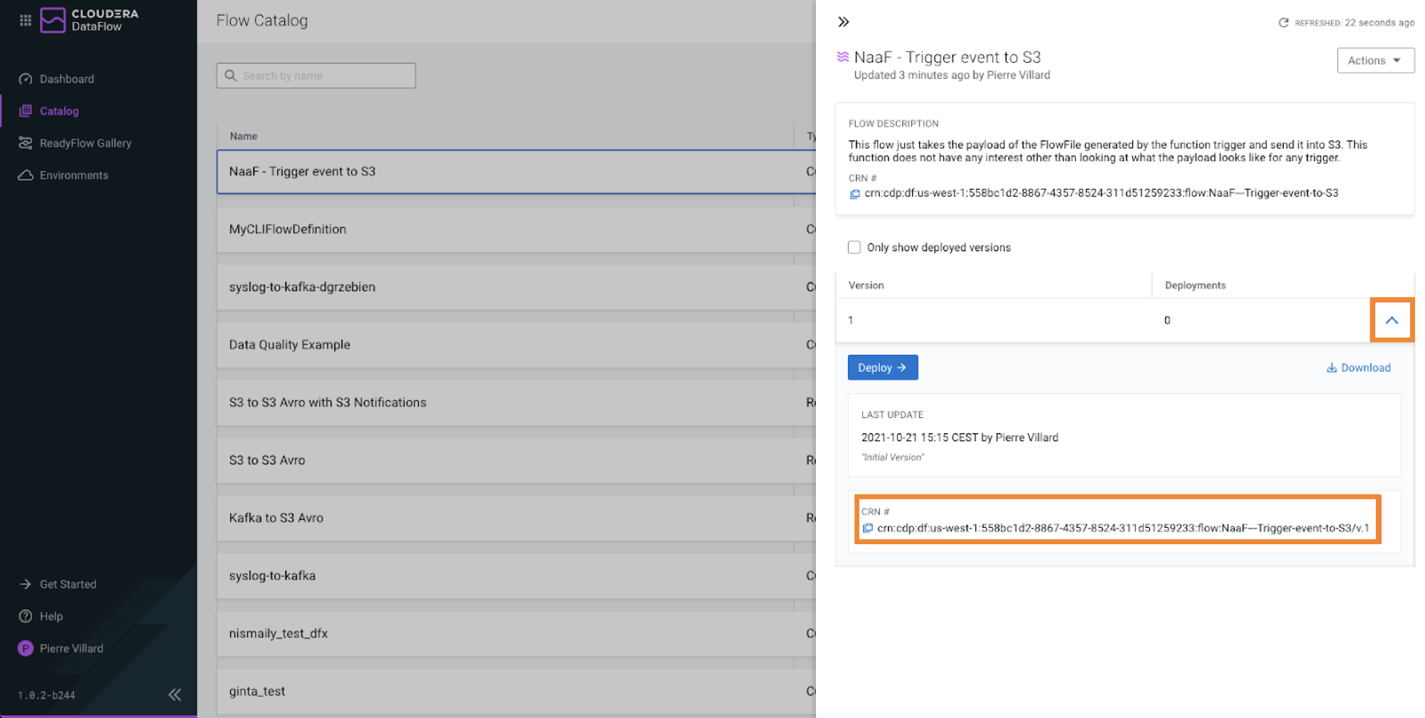 You can retrieve the CRN by checking the flow in the Cloudera Data Flow