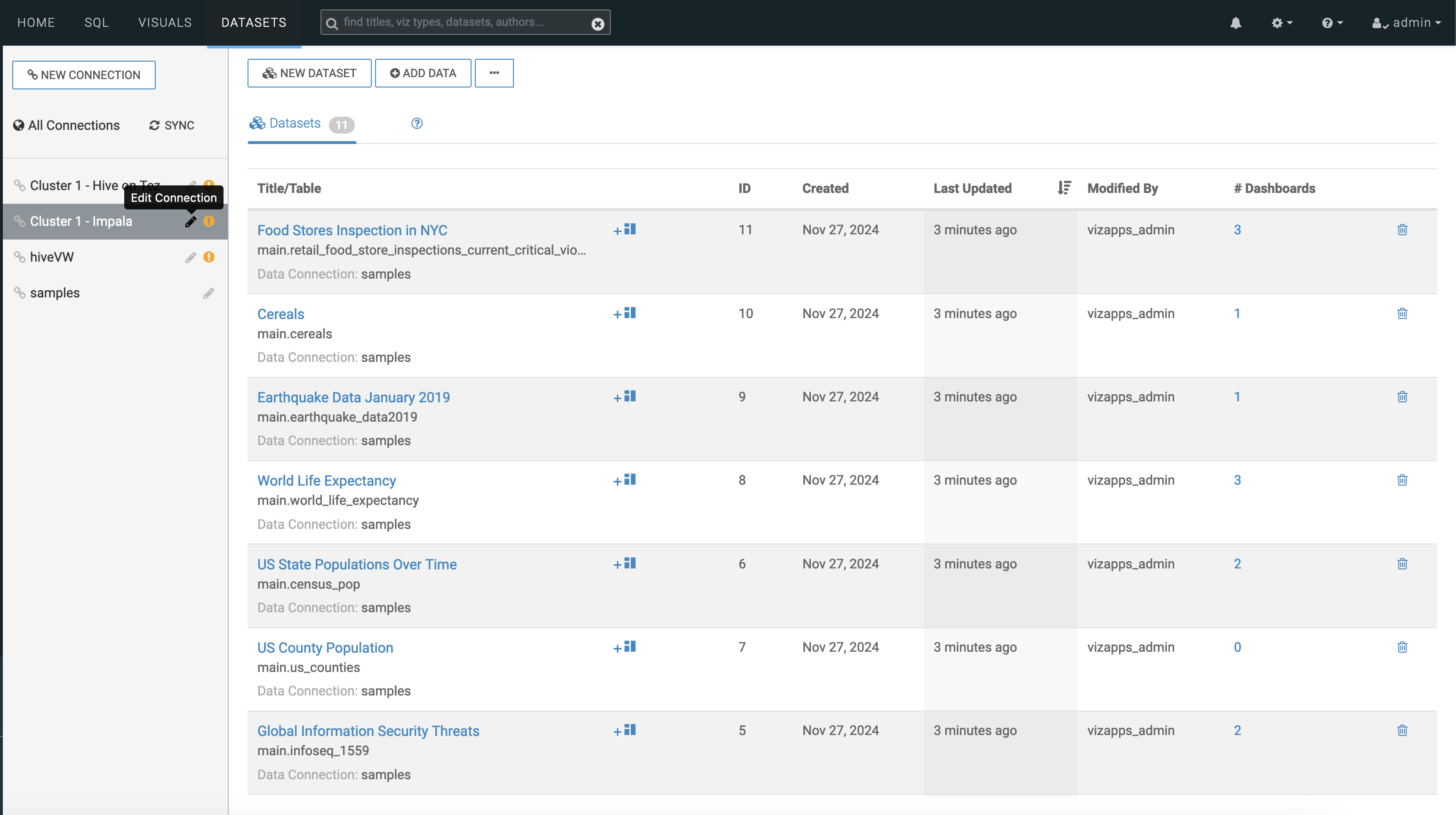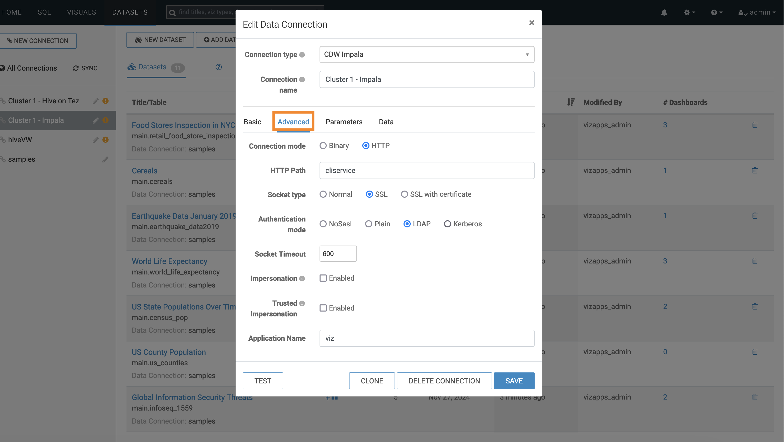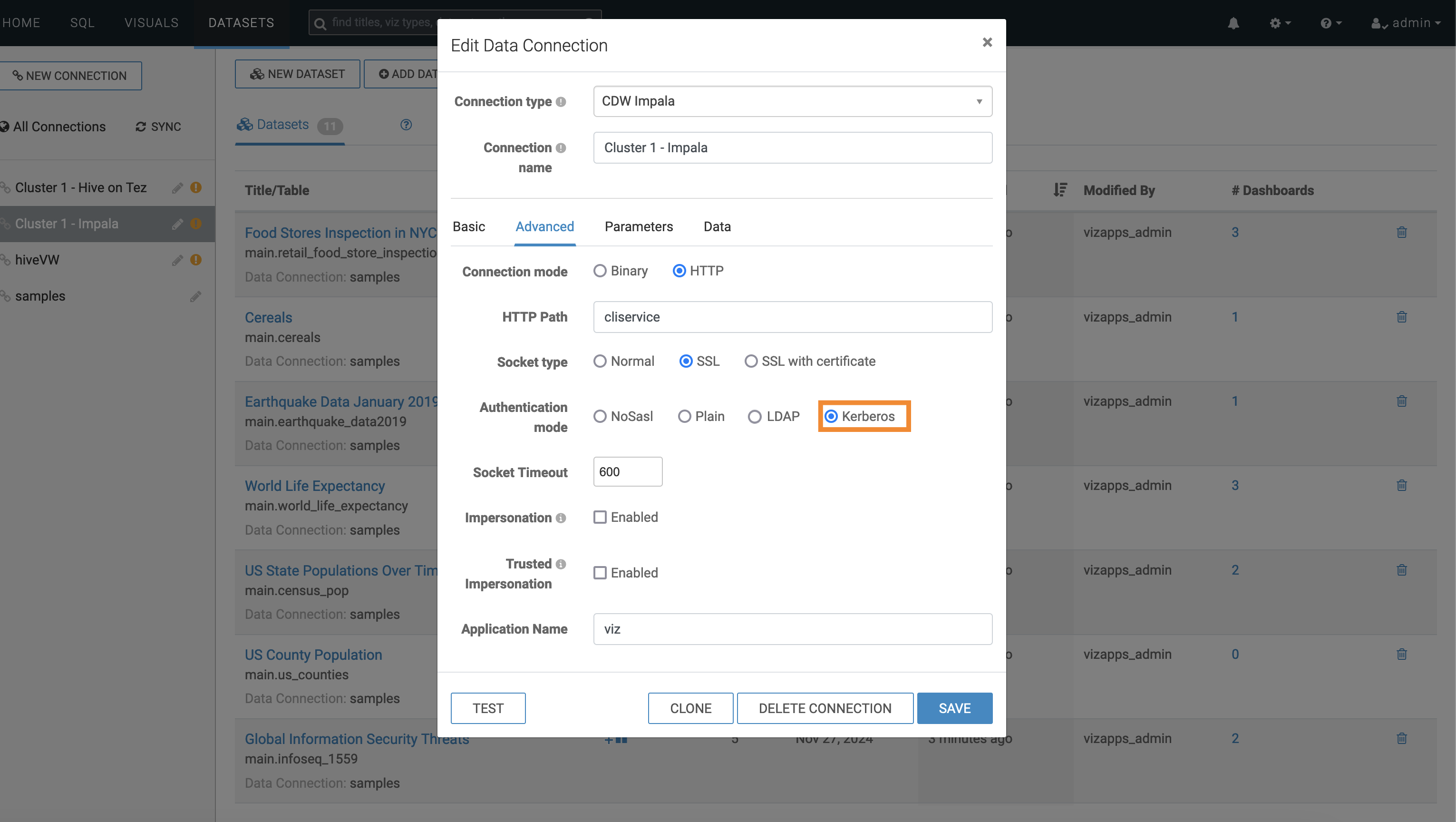 For starting Cloudera Data Visualization on premises for Hive and Impala switch to Kerberos Authentication mode in the Edit Data Connection page:- Select the required connection in the left navigation and click Edit