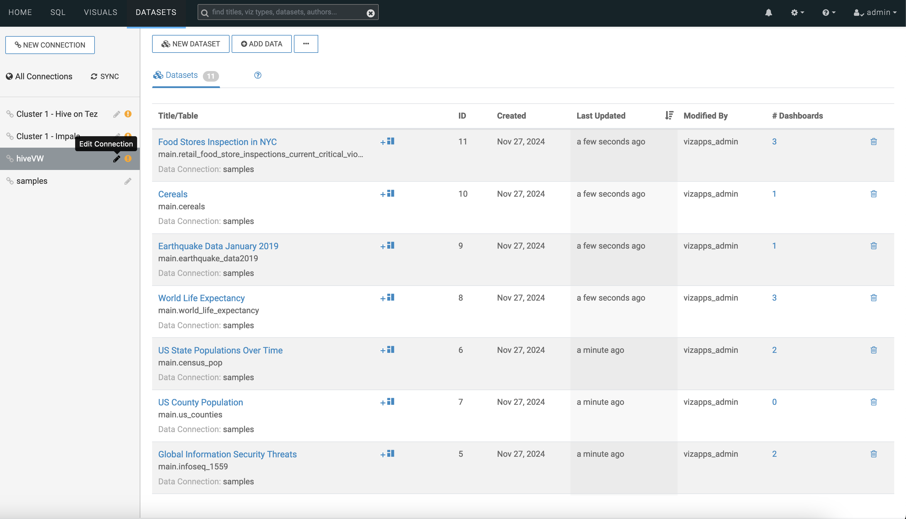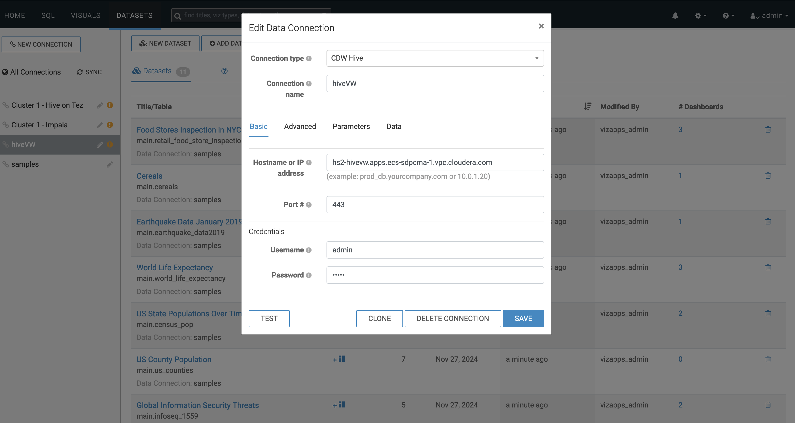 For starting Cloudera Data Visualization on premises for Hive and Impala Virtual Warehouses, switch to LDAP Authentication mode and add your username and password in the Edit Data Connection page:- Select the required connection in the left navigation and click Edit